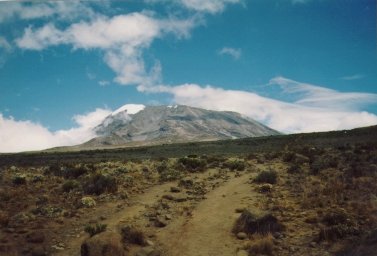 To get to Kibo you ascend about a 1000 feet from Horombo, then descend a few hundred feet into the Saddle. The Saddle in a desert at 13000 feet. It is the open, windswept area between the main cone of Kibo and the secondary cones of the rest of the mountain. It is several miles across with two parallel trails visible in the sand and gravel. From a distance they look like the tire tracks of a truck, but no vehicles go that high. They are actually two trails which seemed to serve as inbound and outbound lanes to Kibo Hut.